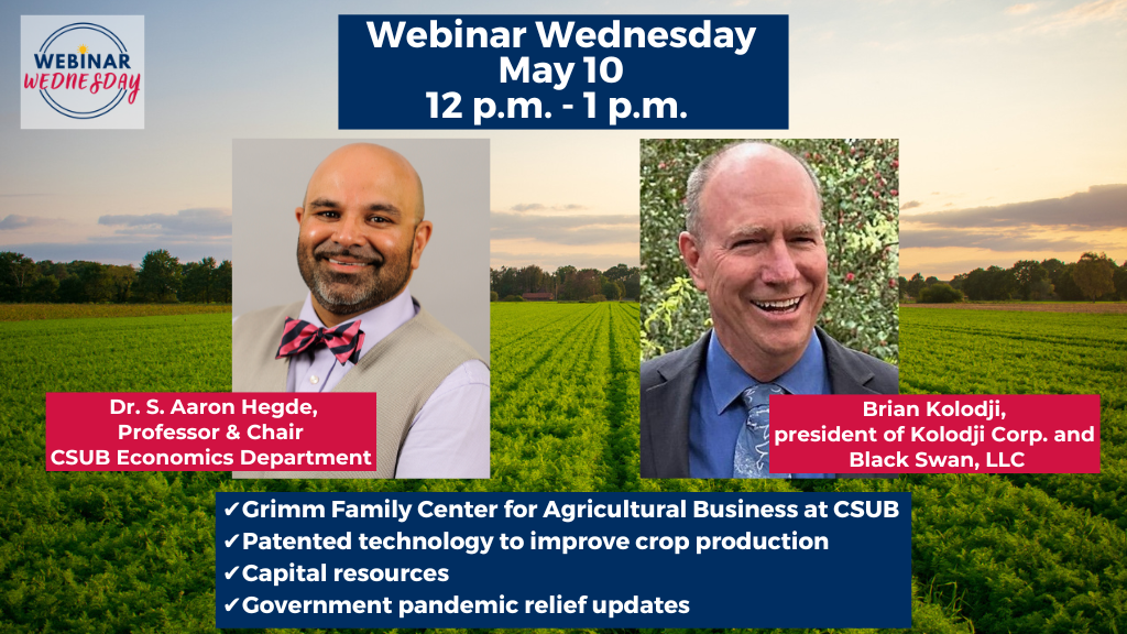 Bearden will also be joined by Dr. Aaron Hegde, chairman of the Economics Department at CSUB and co-director of the university’s Grimm Family Center for Agricultural Business. Dr. Hegde will discuss the Grimm Family Center’s planned events and programs, opportunities for student field experience and research, and the use of emerging technologies.