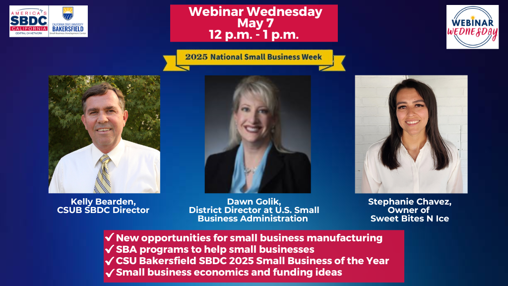 On this week’s free webinar celebrating National Small Business Week, host and SBDC director, Kelly Bearden will be joined by Dawn Golik, District Director for the U.S. Small Business Administration’s Fresno District that covers the San Joaquin Valley, Central Coast, and Eastern Sierra regions. Golik will provide details on new opportunities the SBA has available for small business manufacturing, and the wide variety of programs to help small businesses start, grow, or scale up.