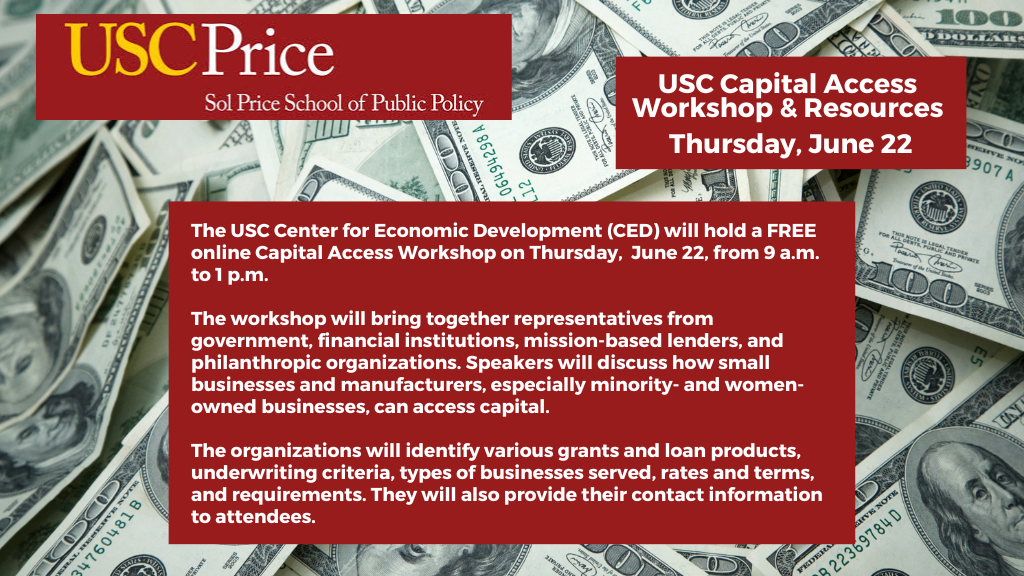 The USC Center for Economic Development (CED) will hold a FREE online Capital Access Workshop on Thursday, June 22, from 9 a.m. to 1 p.m.